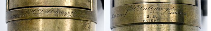 The lens above is an example, a 2B Quick Acting Portrait lens with rack and pinion focus. Quick Acting Portrait lenses were made in several different sizes, and they are only inscribed with the name J.H.Dallmeyer, the serial number and London, as illustrated by this example, below, left.